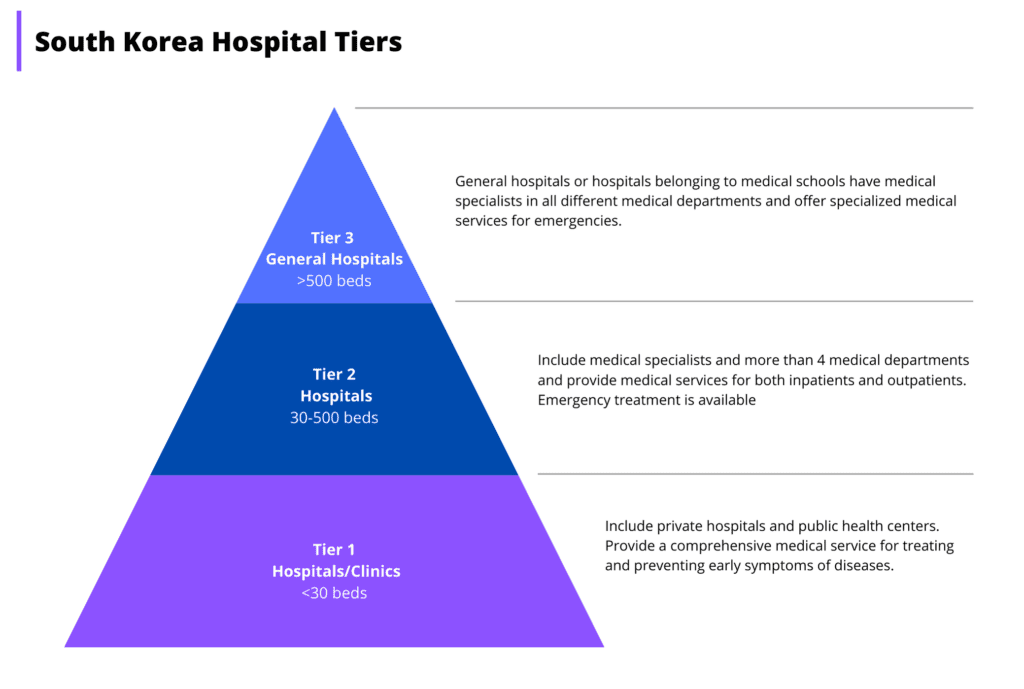 First, rather than having a tiered system for medical services, South Korea has a tiered system for types of hospitals. IFEZ Global Center and Expat Guide Korea provide an excellent explanation of how this tiered system works (note: these articles label the tier system differently, I will be referencing the levels listed on the IFEZ site). Primary healthcare in Korea falls under the services of tier 1 hospitals/clinics. In addition to family and internal medicine-type services, tier 1 hospitals/clinics in South Korea may include some specialized services. See a list of specialized services that may fall under the tier 1 hospital domain here.