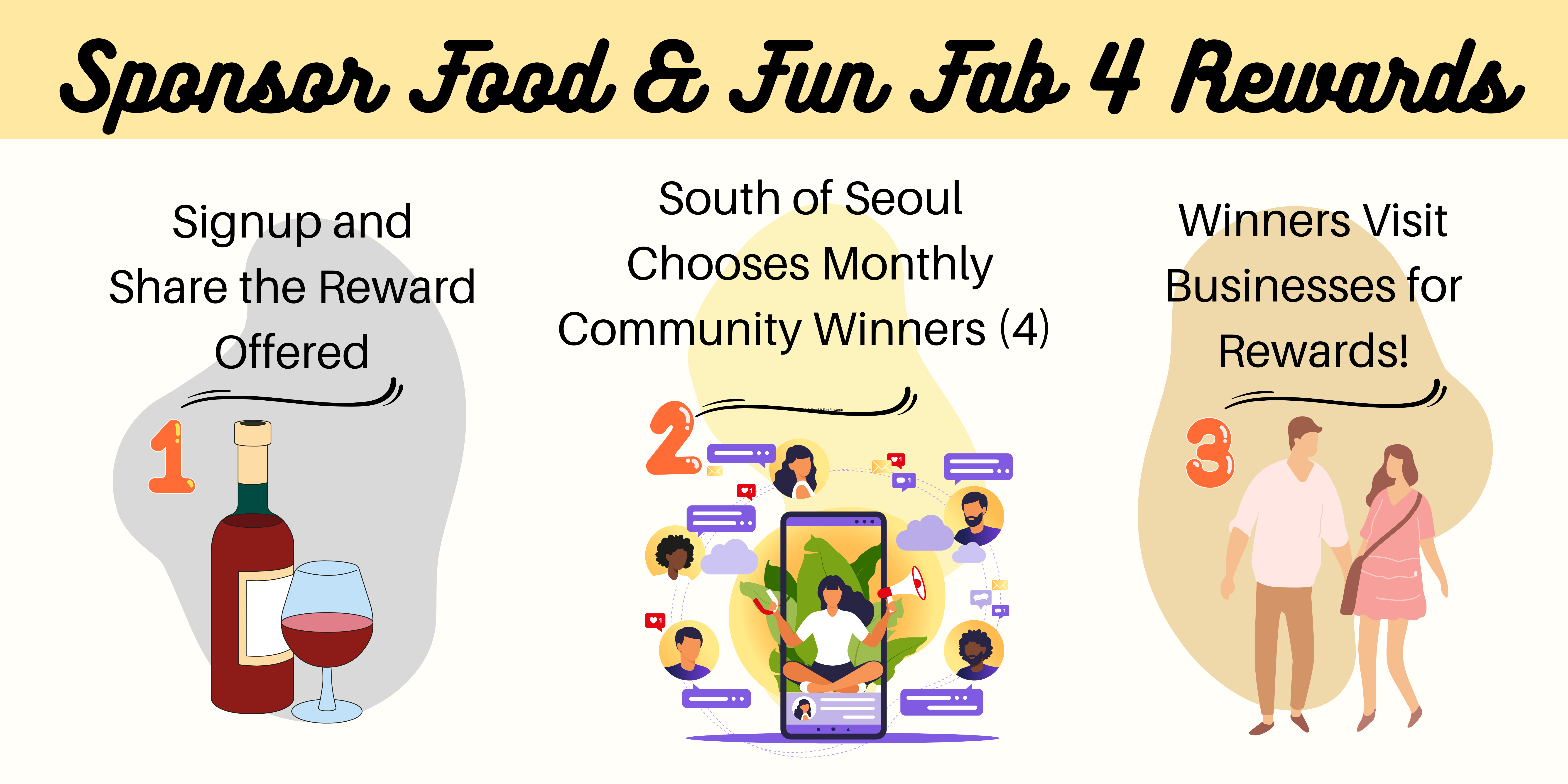 You can signup and let us know what you would like to offer as rewards to the four Fab 4 winners each month. Your rewards can change monthly. South of Seoul will review each business reward offer to ensure it meets organizational guidelines.
