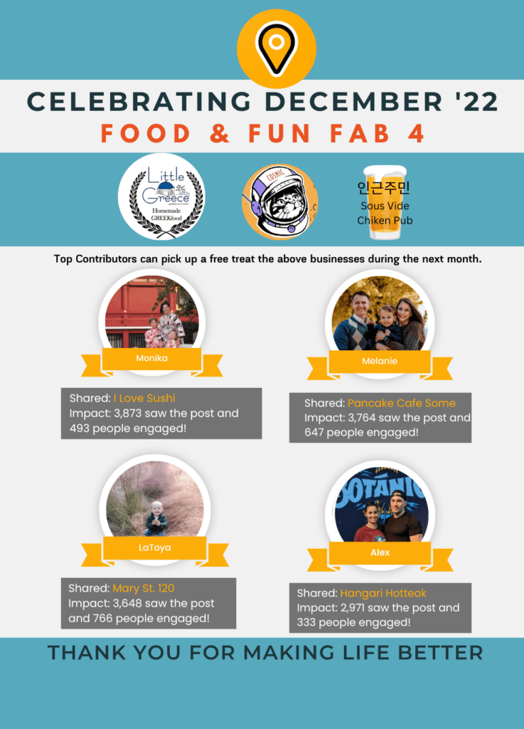 Fab 4 Rewards are free gifts contributed by businesses that the Food & Fun Fab 4 winners can collect each month. Such gifts show that businesses value the time and effort community members contribute to promoting area businesses.