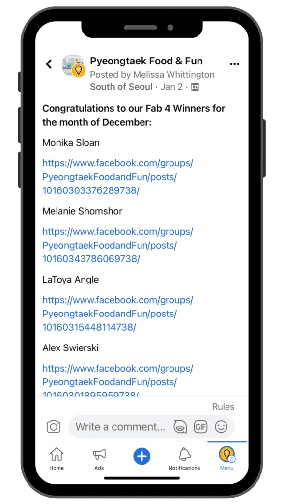 In 2022, South of Seoul began with a program called the ‘Food & Fun Fab 4’. The program recognized 4 active Pyeongtaek Food & Fun community members for their contributions to the community. Each of the 4 winners of the ‘Fab 4’ can visit businesses around Pyeongtaek and neighboring communities to collect “Fab 4 Rewards”.