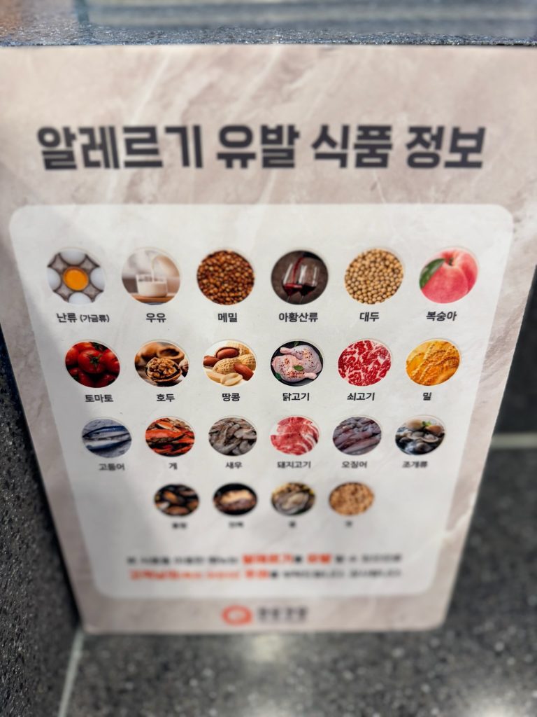 Korea requires restaurants to post a list of foods that cause allergies used in their kitchens. This will be posted as one sign rather than by dish. The QooQoo list is shown below. Some restaurants may only have the words listed. You can use Papago or ChatGPT.