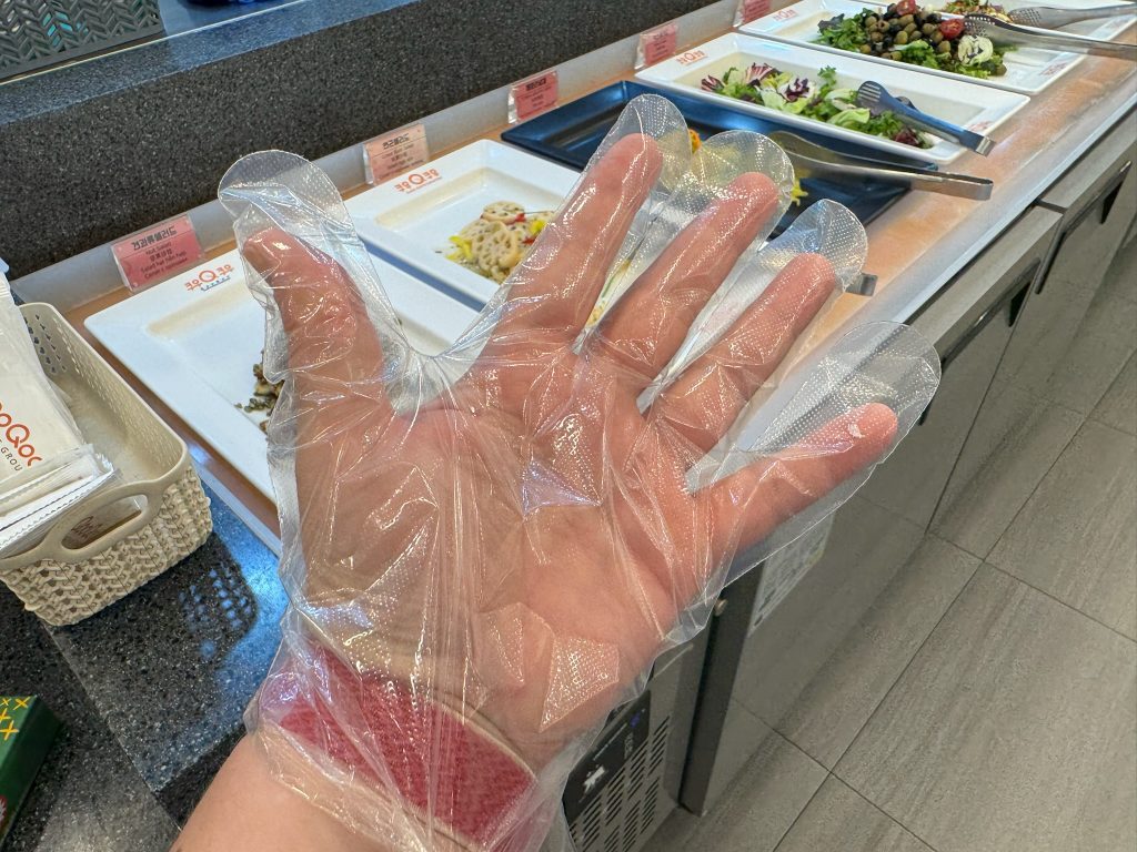 Some food may feel hard to handle with utensils, like ribs or chicken wings. In this case, you can often find gloves sitting near the utensils or request gloves from the servers. These take away the mess! Great for kids as well. Highly recommend using these.