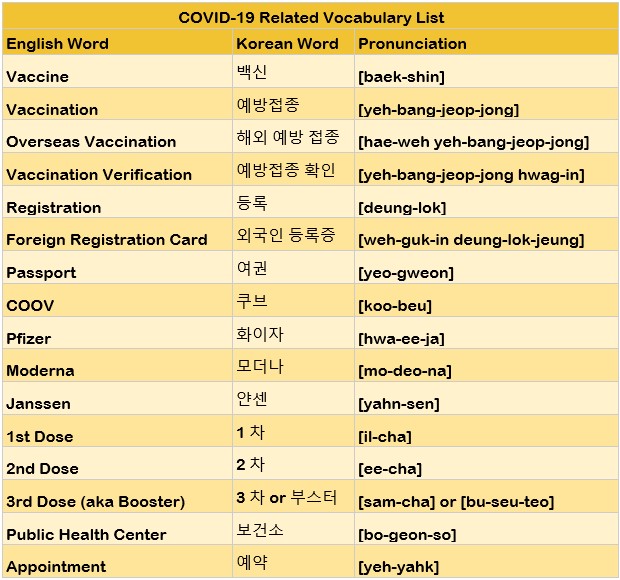 Let the front desk staff know that you are there to register your overseas vaccination. (The public health centers may not have English-speaking staff, so we have provided you with a few useful vocabulary and phrases below. You can also utilize 1330 or BBB Korea for free translation services.)