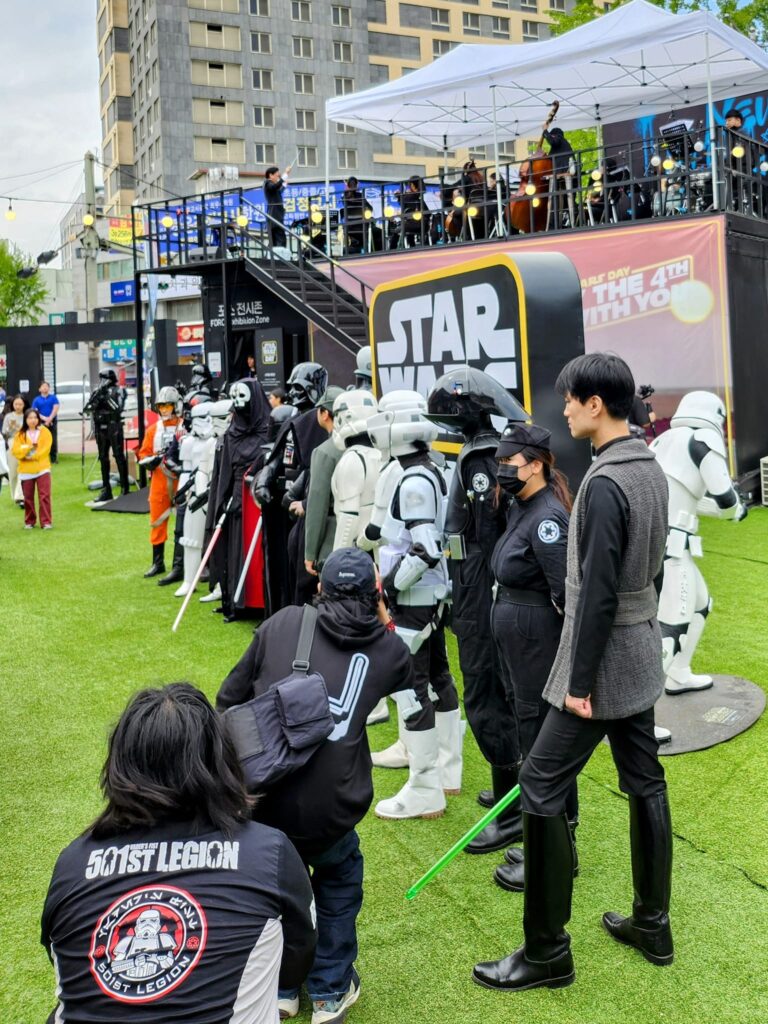The day’s schedule included parades and picture-taking with the 501st Legion and Rebel Legion Korea, a marching band that played music from the Star Wars Soundtrack on the second level of a Star Wars Dome built across Ogeori Culture Plaza. The Star Wars dome included photo zones, of course, Star Wars Collectables Museum, with costumes signed by the actors themselves, such as Ming-Na Wen, who plays Fennec Shand, Star Wars trailer theater, a Star Wars Merchandise store, and a stamp tour which allowed players to go home with 2 Star Wars posters. My toddler enjoyed collecting stamps as much as earning new Star Wars posters.