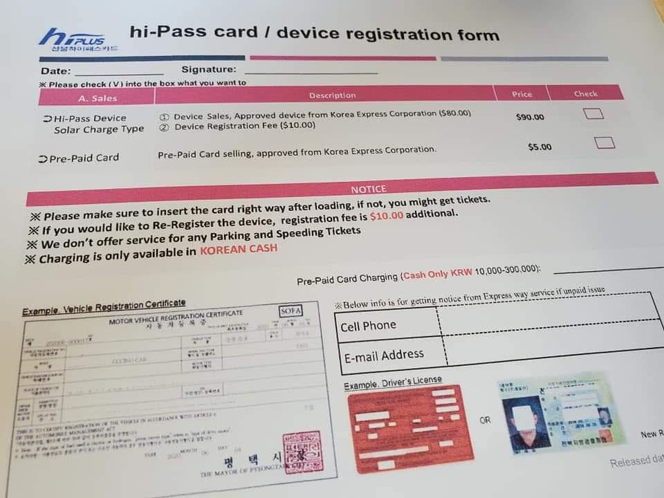 To register for the Hi-Pass you will need your Korean vehicle registration, driver’s license, and possibly a registration fee depending on the situation.