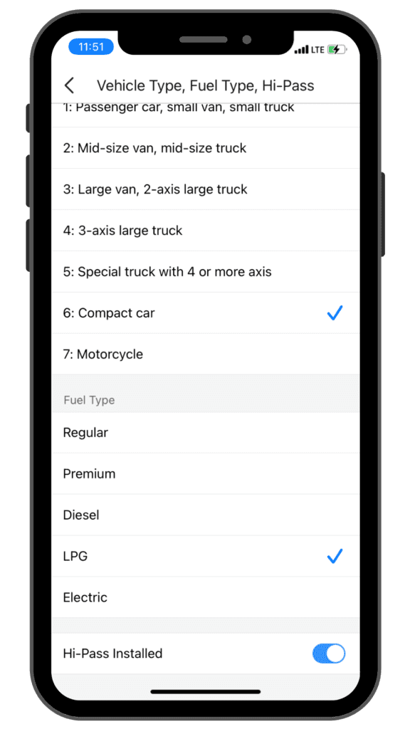 Make sure the expressway toll fees reflected in your Naver Map or Kakao Map apps are correct by customizing your app to reflect your information. Below you can see that the user has a small car using an alternate fuel and has HiPass installed. Such detail will ensure that their estimated tolls reflect their individual situation.