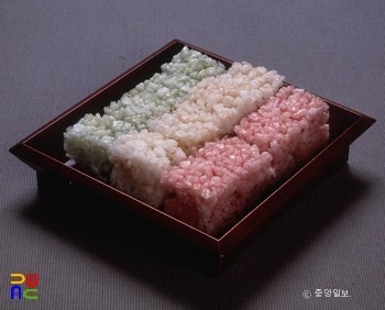 Yugwa is a traditional snack made from glutinous rice dough that is dried and fried. It is coated with grain syrup or honey and often topped with sesame seeds or puffed rice. Yugwa is crispy on the outside, but melts gently in the mouth like snow, blending softly with the chewy sweetness of the syrup.