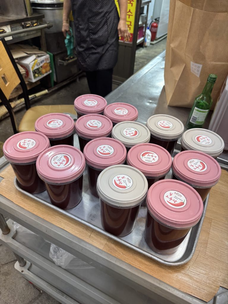At its essence, gochujang (고추장) is a fermented chili paste with a complex balance of spicy, sweet, and umami flavors. The sauce’s foundational ingredients generally include Korean red chili powder (gochugaru, 고춧가루), glutinous rice flour (chapssalgaru, 찹쌀가루), fermented soybean powder (meju garu, 메주가루), salt (소금), and sometimes barley malt powder (yeotgireum, 엿기름) for additional sweetness. The fermentation process lasts anywhere from 2 to 3 months, and the result is a versatile ingredient used in various dishes. Our teacher also added soju to her gochujang.