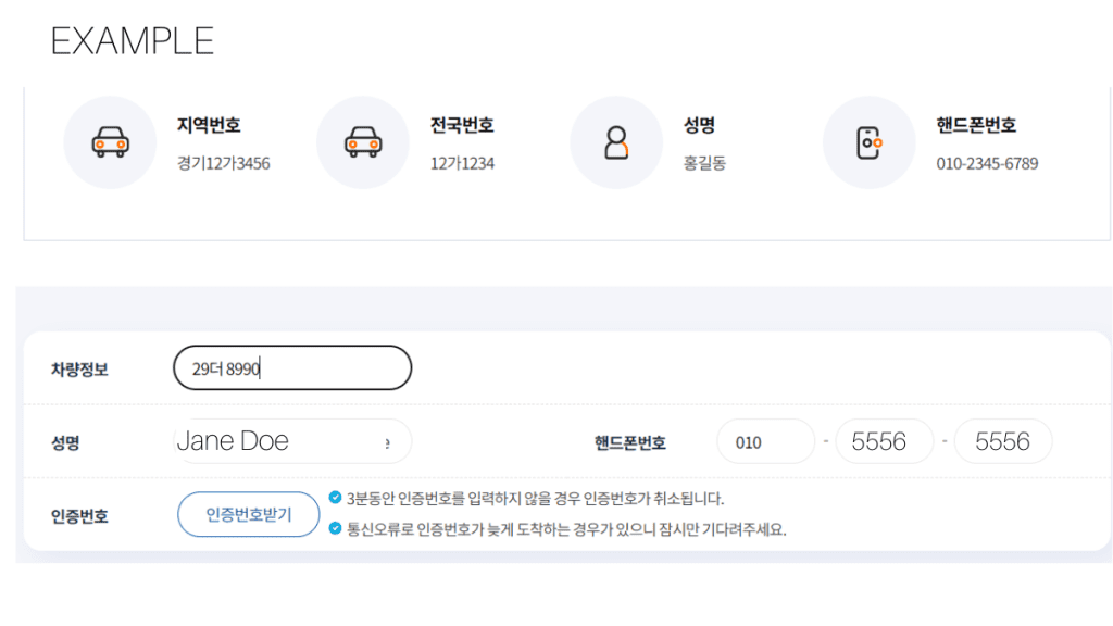 Please note that only the owner of the car can receive parking alerts. Therefore, the phone number you use to register for alerts must be the same phone number used to register the car. You can learn more about Korea’s resident identity verification system here.