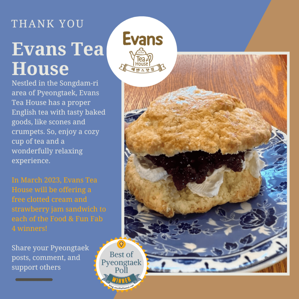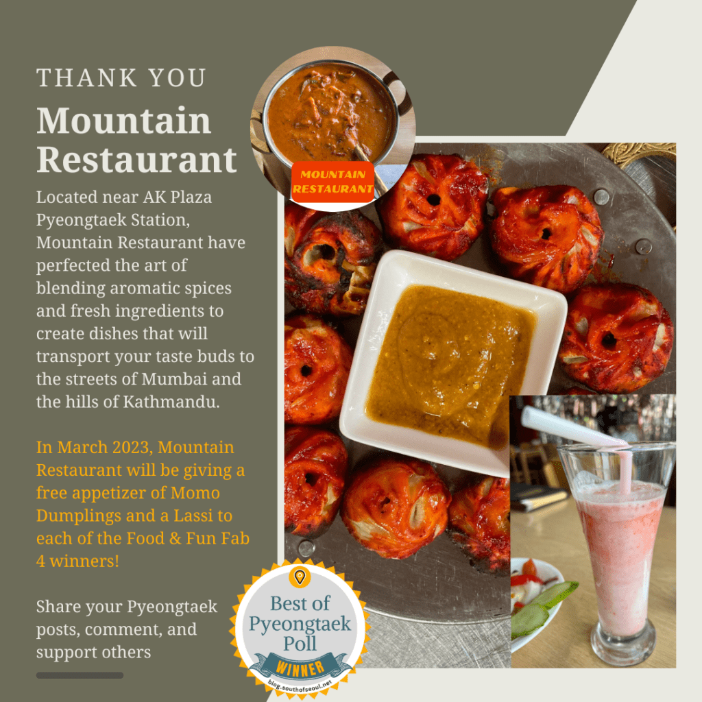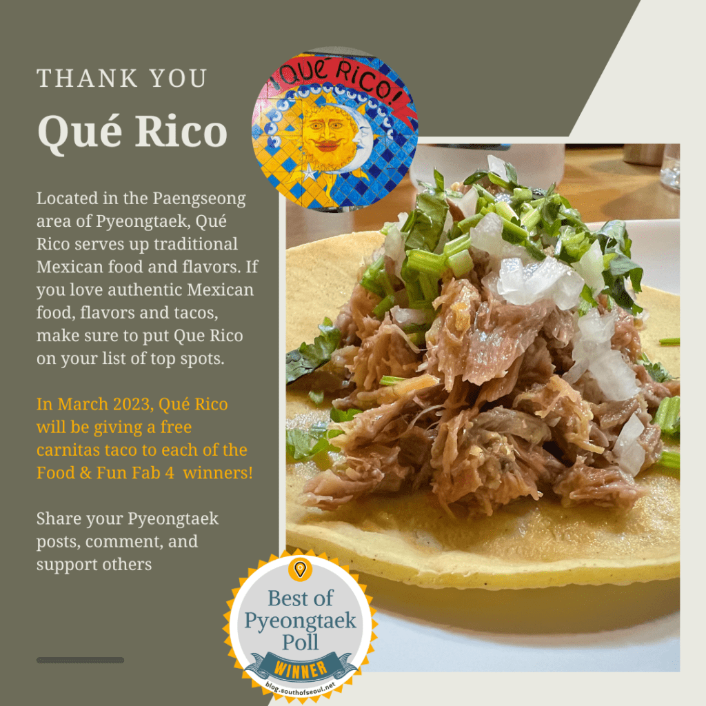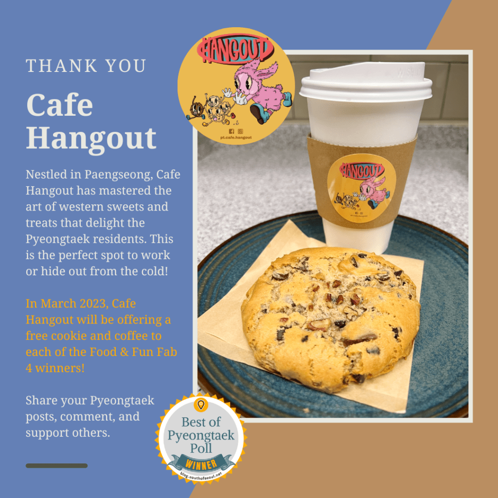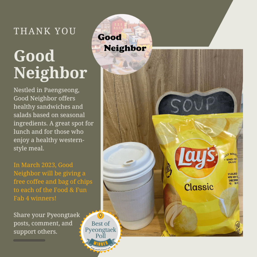 Starting in November 2022, South of Seoul began partnering with local businesses to create the Fab Four Awards. Each month four Pyeongtaek Food & Fun contributors are selected for their contributions to the community. In total, we currently have 20 local businesses that will be offering rewards to the winners.