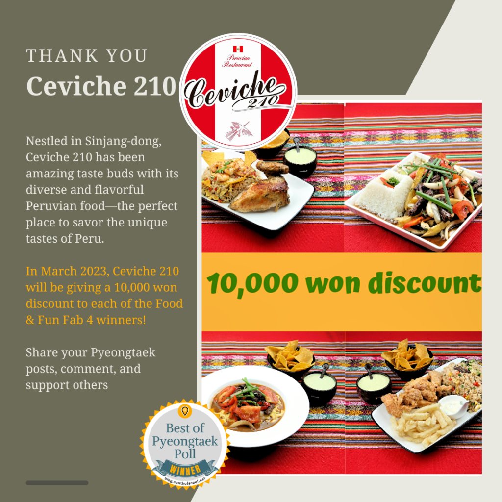 Ceviche 210 is a popular Peruvian restaurant near Osan Air Base in Songtan, Pyeongtaek. Known for authentic dishes like ceviche, lomo saltado, and arroz chaufa, it delivers bold flavors and warm hospitality. This family-run spot has won multiple Best of Pyeongtaek awards, including Best Peruvian or Best South American Restaurant (2017–2024). A go-to for both expats and locals craving a true taste of Peru in Korea.