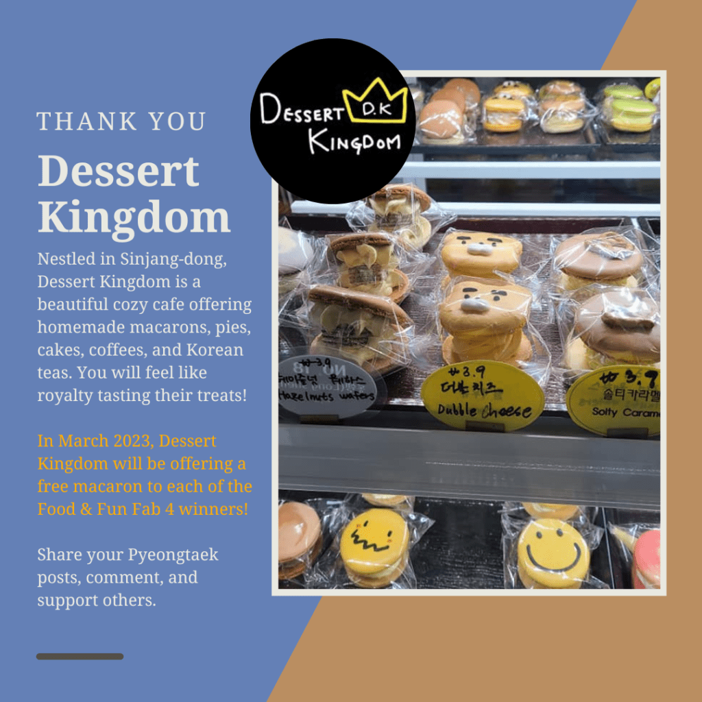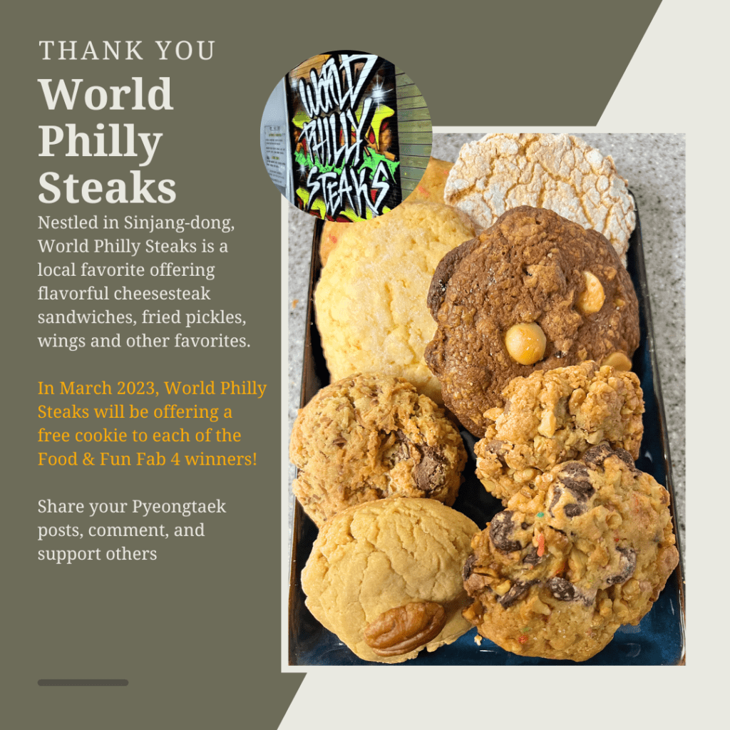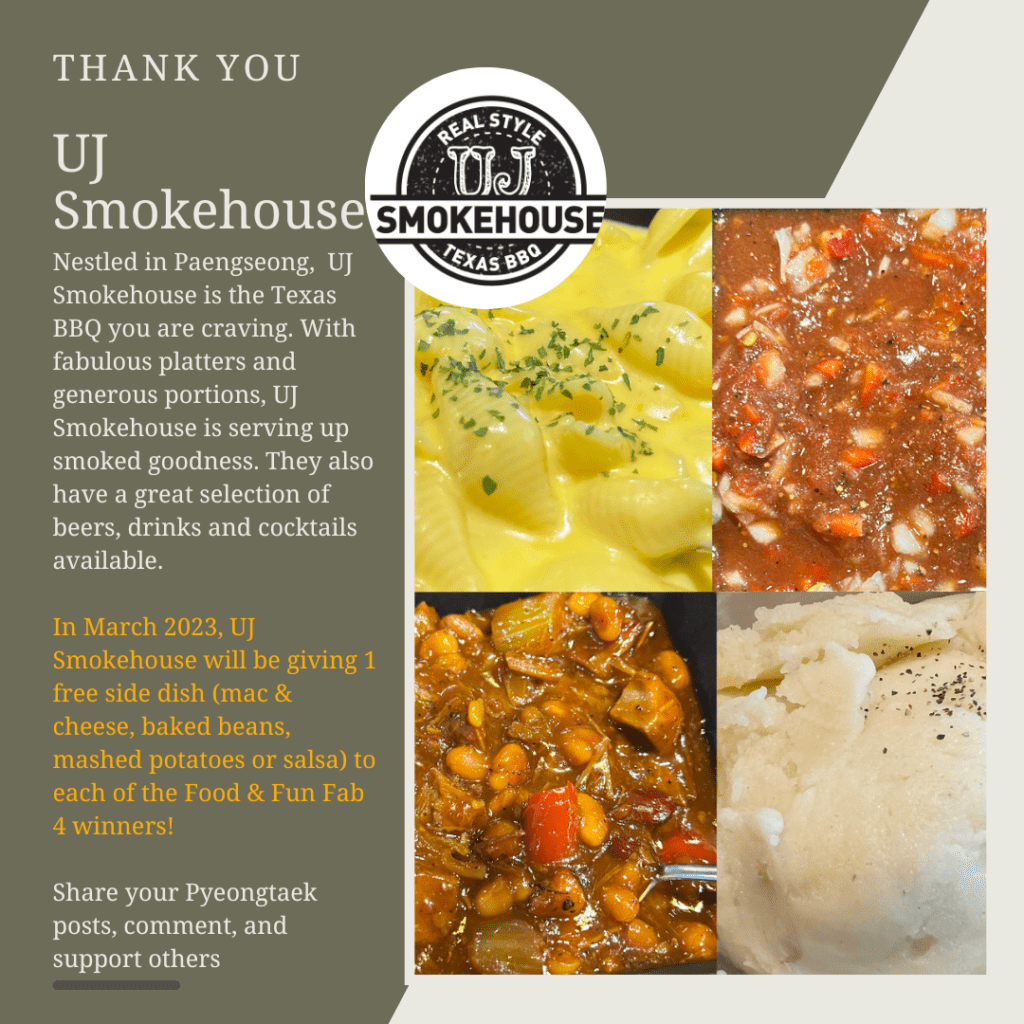 We are happy to announce our Pyeongtaek Food & Fun February Fab 4 winners for their valued participation. Winners for February 2023 can collect their awards during March 2023.