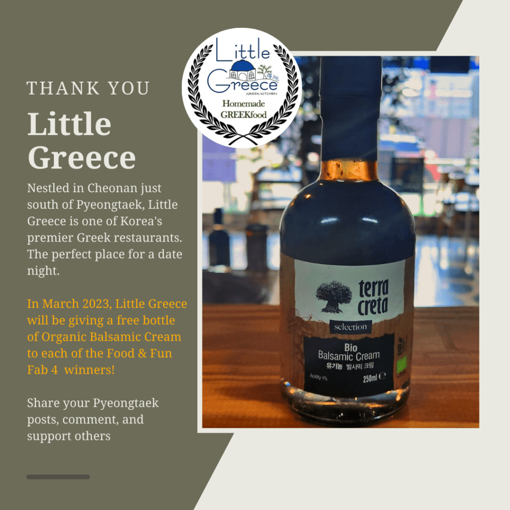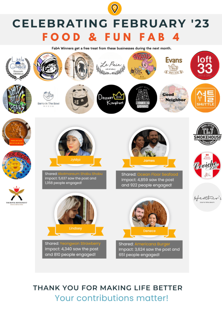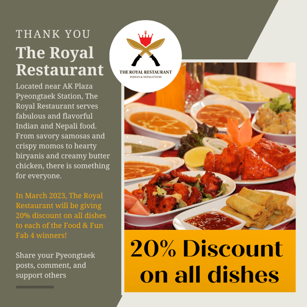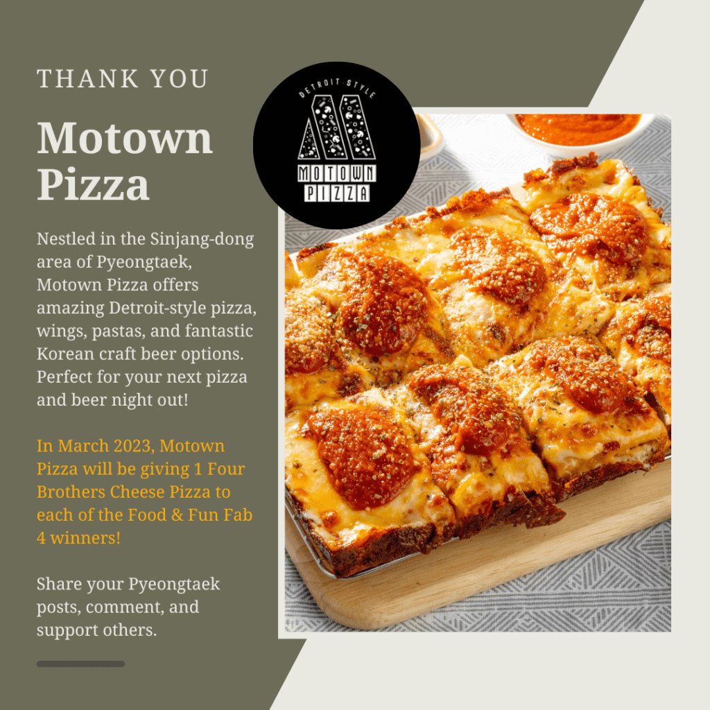 We are happy to announce our Pyeongtaek Food & Fun February Fab 4 winners for their valued participation. Winners for February 2023 can collect their awards during March 2023.