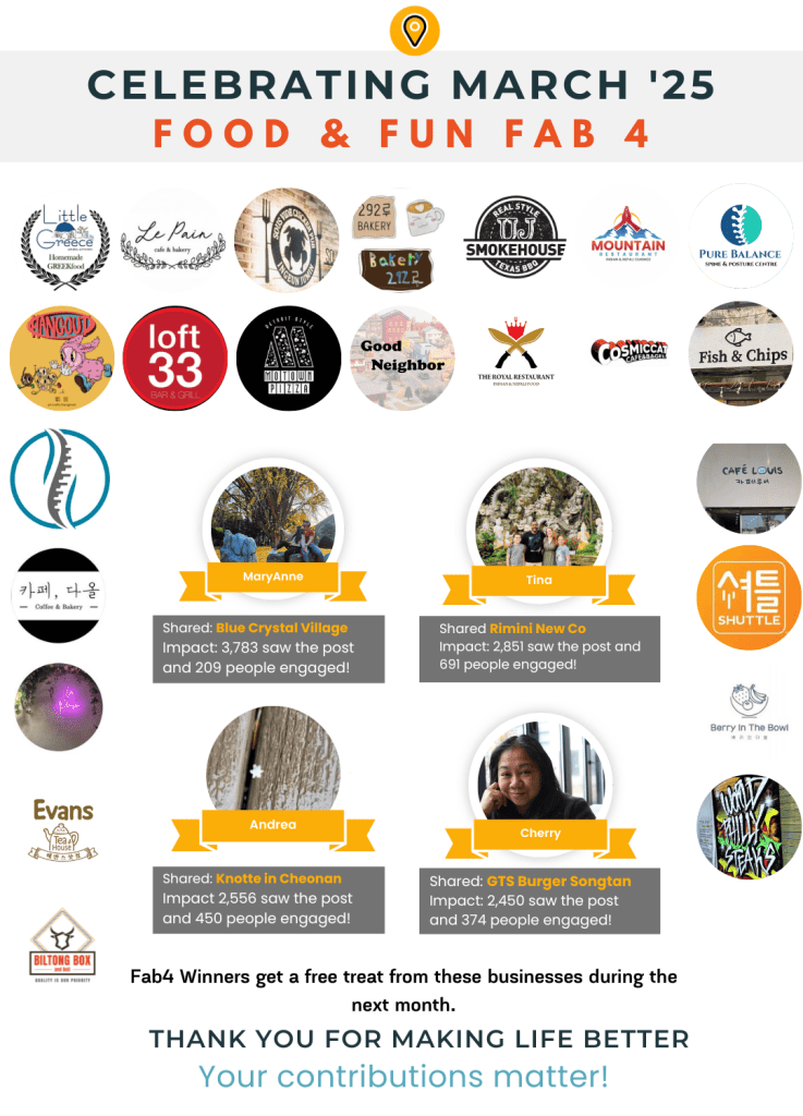 We are happy to announce our Pyeongtaek Food & Fun’s Fab 4 March 2025 winners for their valued participation. Winners for March 2025 can collect their awards during April 2025.