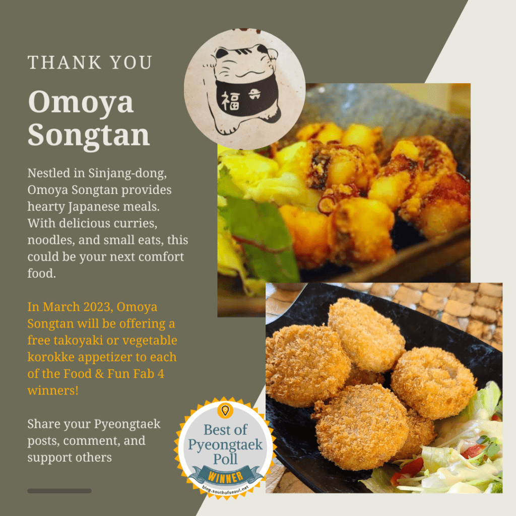 Starting in November 2022, South of Seoul began partnering with local businesses to create the Fab Four Awards. Each month four Pyeongtaek Food & Fun contributors are selected for their contributions to the community. In total, we currently have 23 local businesses that will be offering rewards to the winners.