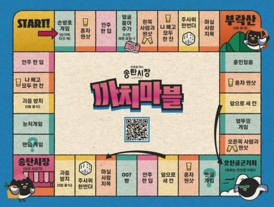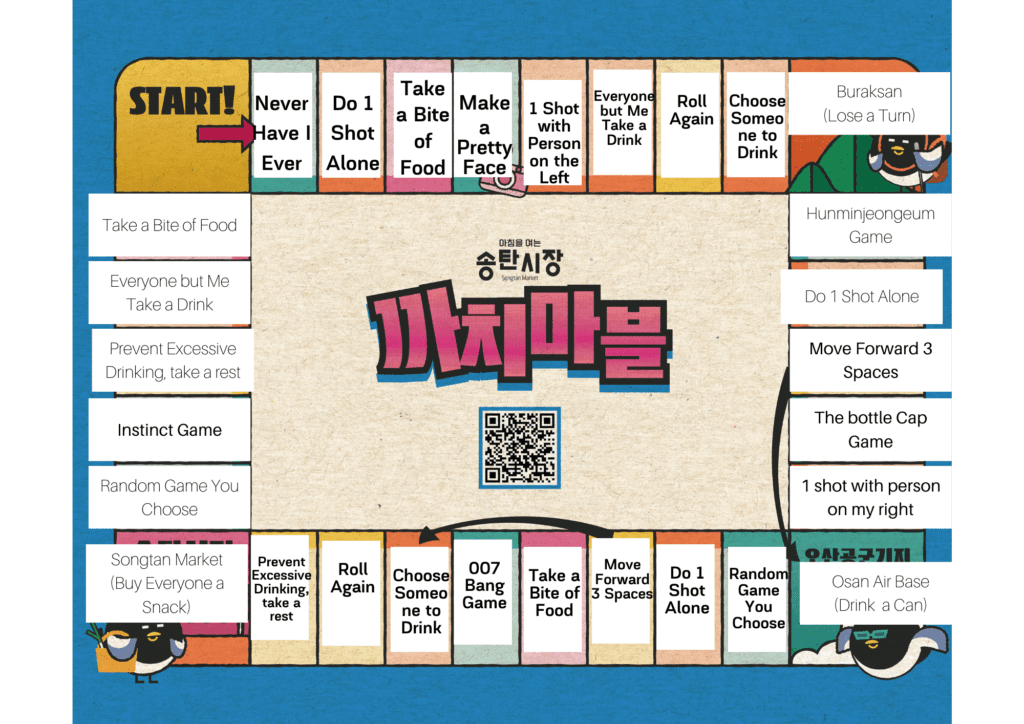 The Songtan Market created their own drinking board game for the Songtan Market BBQ Festival. In order to ensure everyone has fun, South of Seoul volunteers offered to 1) translate each of the board game spaces and 2) create a guide for the included Korean games so that everyone can play together! The Korean Board game looks like this: