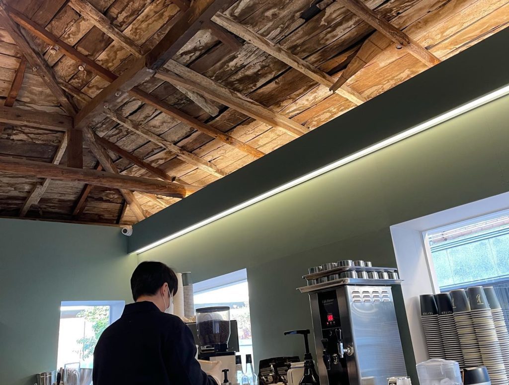 Small modern cafe with a signature pistachio latte and yogurt cheesecakes.