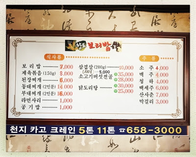 Pro tip: (2인분) means it serves two people. Can’t order for an individual. 식사류 = Food Menu 보리밥 = BoriBap 제육뽁음 = jeyugbokk-eum 된정찌개 = doenjangjjigae 동대찌개 = dongdaejjigae 부대찌개 = budaejjigae 라면사리 = Ramon noodles 공기밥 = Rice with beans 삼겹살 = Korean bacon 소고기벗건골 = sogogibeosgeongol 닭도리탕 = dalgdolitang 주류 = Drink Menu 소주 = Soju 맥주 = maekju (Beer) 청하 =cheongha (low alcohol soju type)백서주 = baegseoju (rice alcohol flavored with herbs) 산사춘 = sansachun (wine made from the red fruits of the sansa) 막걸리 = maggeolli (rice wine)